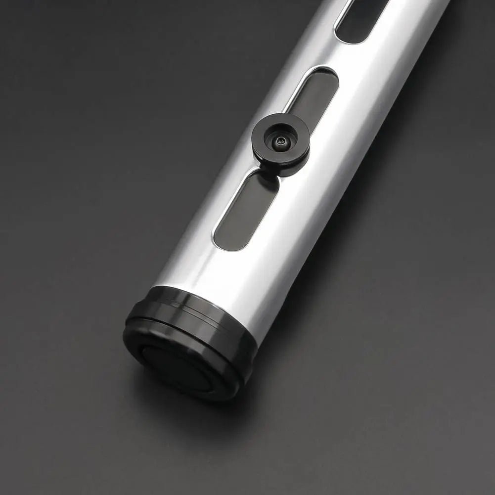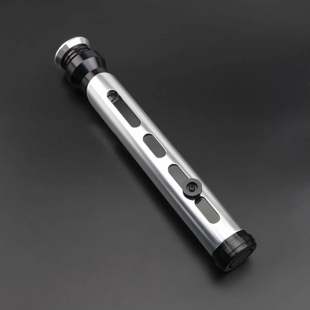 The deep grooves brushed chrome look gives this saber episode 1 vibes and removable chassi system makes the battery easy to maintain! Infact you can remove the static looking pommel cap if you want a louder sound for sacrificing the static look, I changed the Allen screws to black for a cleaner look. The chrome emitter is removable as well as the shroud and pommel and static cap! 10/10 most affordable accurate qui gon on the market today! If you want knurling on the red button you are out of luck but it’s a small detail to give up for such a price factor!