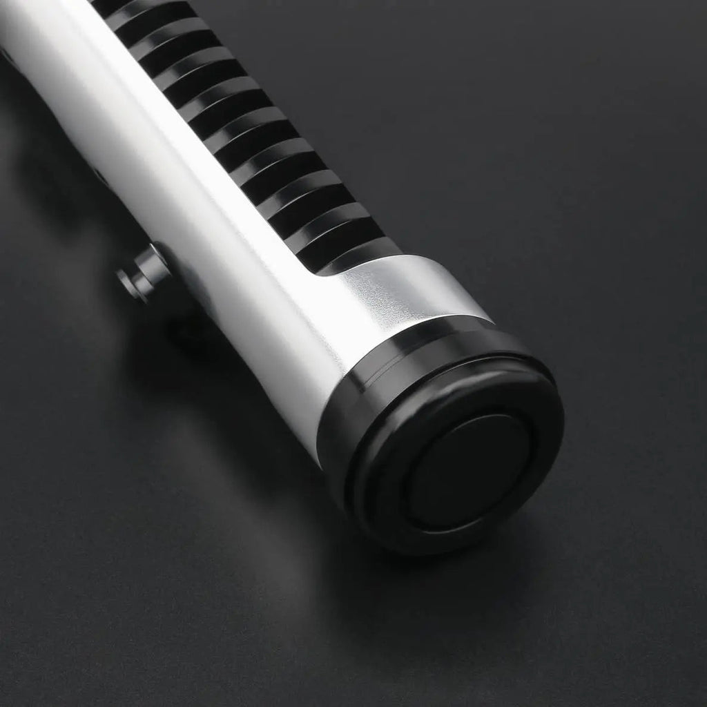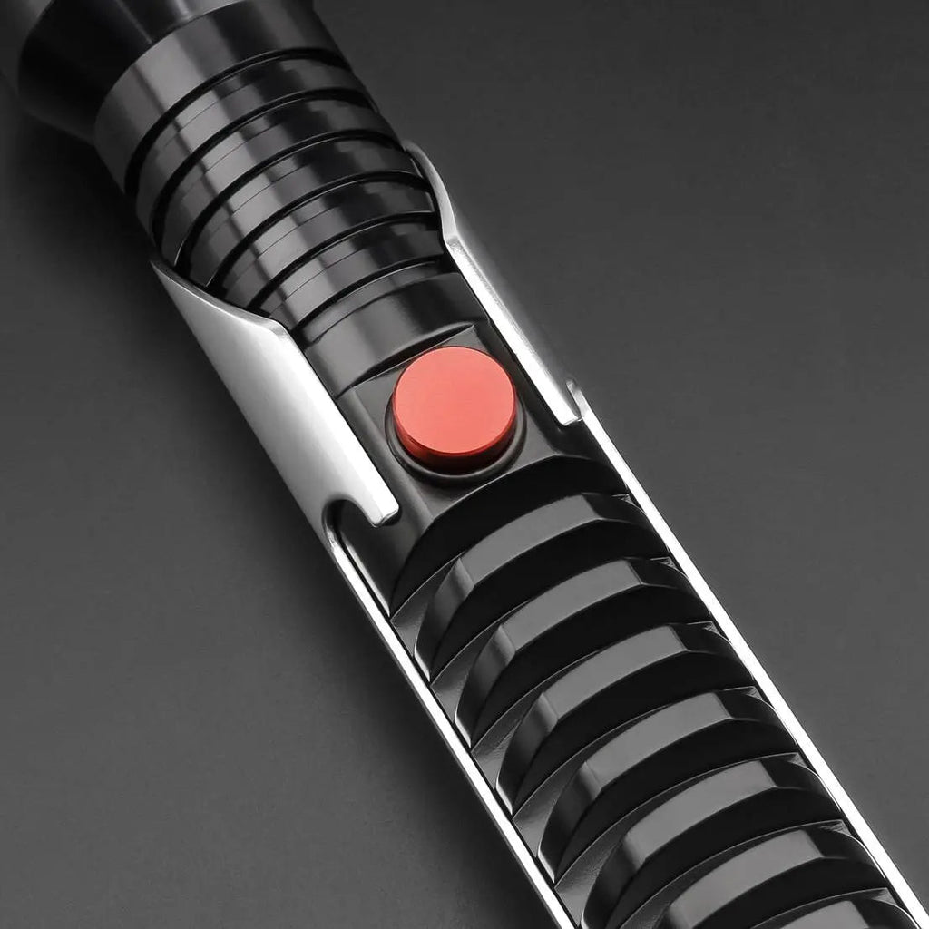 Faithbringer is a very strong saber and consists of one part. The black saber has deep grooves from bottom to top which provide an excellent grip. In the neck to the emitter are circular cutouts that break this pattern. The saber has a large silver plating on the back with single cutouts showing the grooves. The typical red button is how the saber is operated. The charging port is concealed on the inside of the saber. Furthermore, the saber is equipped with a Belt Clip connector / Covertech wheel. This ensures that you can hang the saber on your belt. For this you do need Belt Clip.